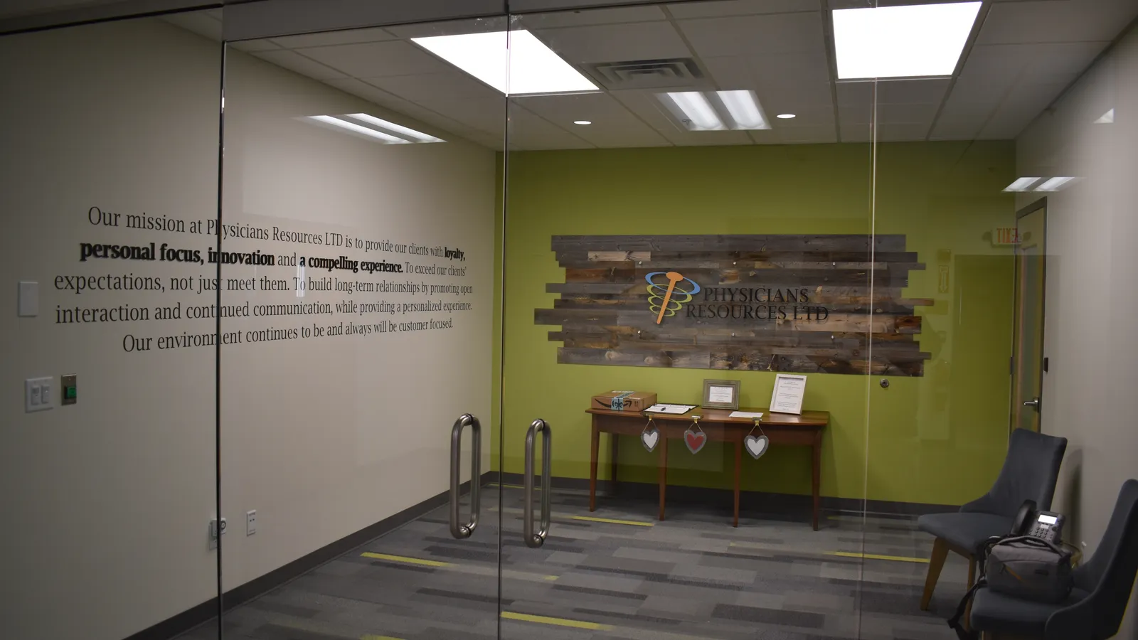 This reception area reimagines healthcare branding by balancing professional credibility with human warmth and approachability. Reclaimed wood feature walls create organic texture that softens the clinical environment, while dimensional logo application establishes clear professional identity. Frosted vinyl elements provide privacy without feeling institutional, contributing to an atmosphere that acknowledges the vulnerability patients feel when seeking care. The design demonstrates that medical environments can be both professionally competent and emotionally supportive, a reflection of patient-centered healthcare philosophy made physical.