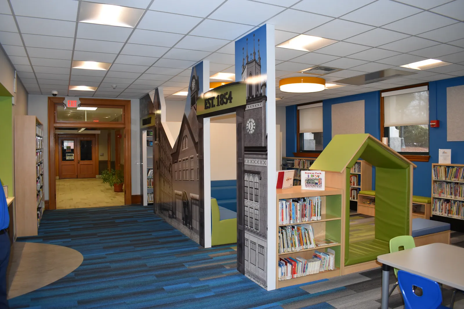 This children's library space masterfully blends the building's industrial mill heritage with vibrant, modern design to create an engaging learning environment. Reclaimed wood accent walls and historical imagery celebrate the location's manufacturing past while dimensional signage and contemporary elements ensure the space feels fresh and welcoming for young readers. The design honors architectural history while serving the needs of 21st-century library patrons, creating a unique sense of place that distinguishes this children's room from typical library spaces.