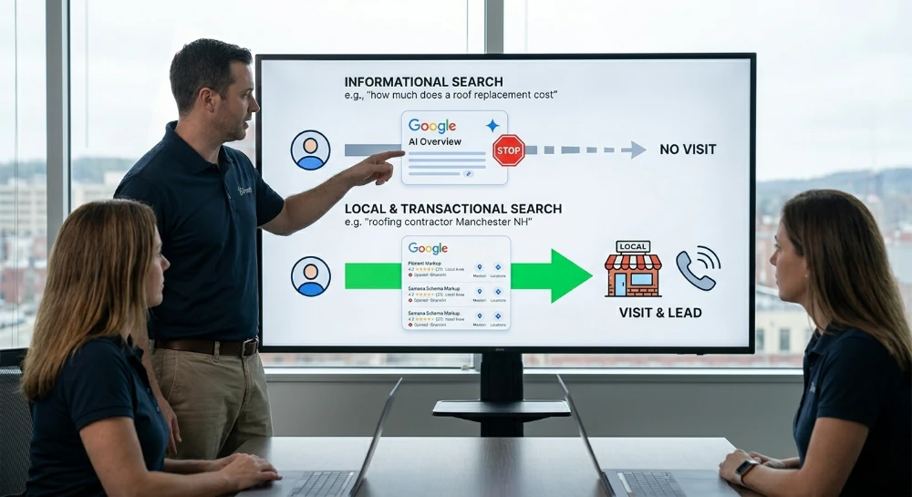 But when someone searches “roofing contractor Manchester NH” or “sign shop near me,” the picture looks completely different. For transactional and local searches, the traditional map pack with three business listings still dominates. These are the searches that matter most to small and mid-size businesses. The people who are ready to call or walk in are still finding businesses the way they always have.